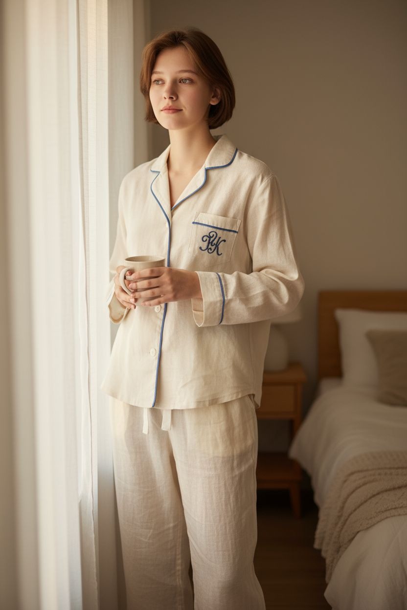 2025年の秋冬にぴったりな、フランス、フランドル地方のサフィラン社44番手リネ糸100%を使用した綾織の、柔らかくつやのある生地でできたパジャマをリリース。