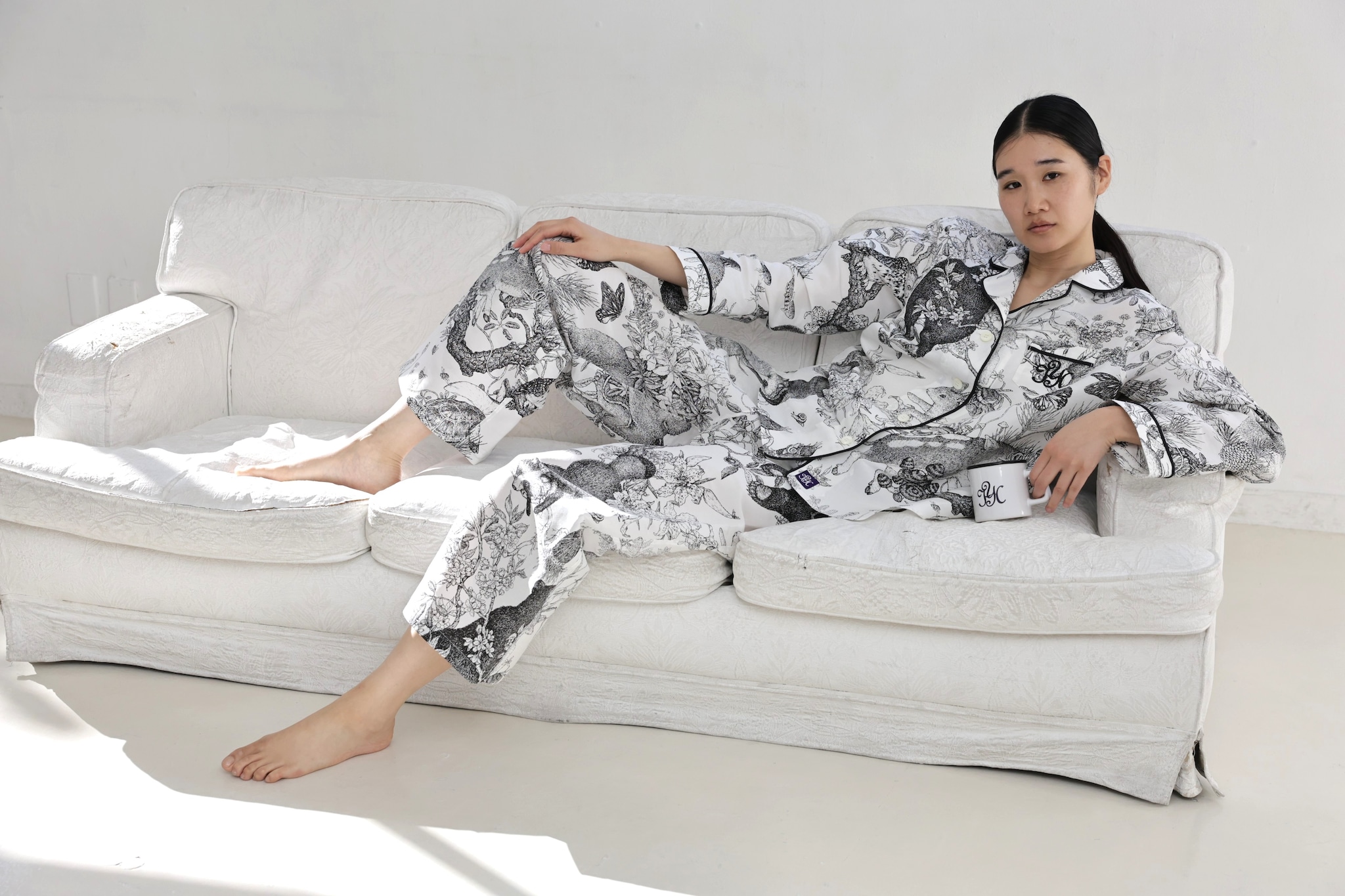 日本の動植物の群像を描く人気のドローイングアーティスト村山大明(むらやま ともあき)氏がヒデコ&ヨーゴホームのために書下ろした線画「Dream of Japanese Forest」をプリントしたオリジナルパジャマです。
